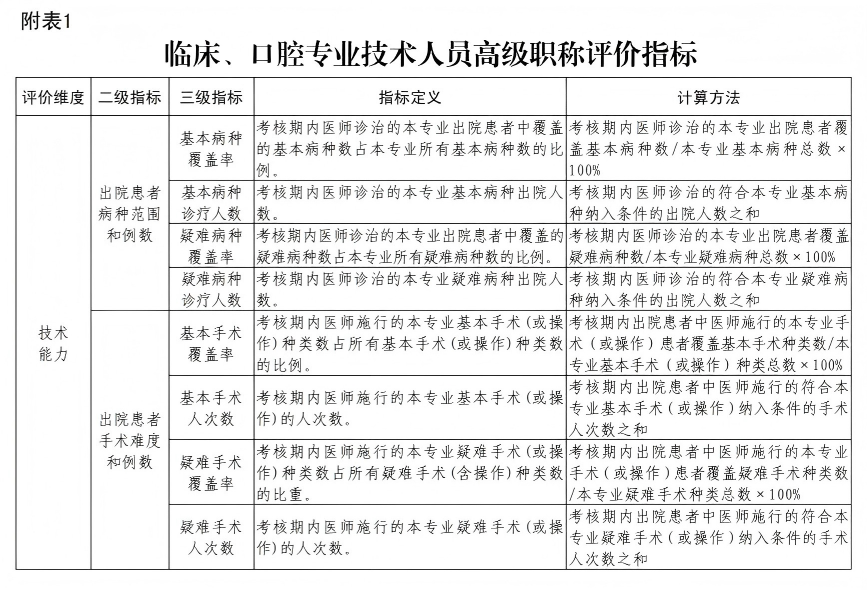 (一)专业技术能力。在常见病的预防、诊断、治疗等方 面有较丰富的临床经验,具有娴熟的技术操作能力,能熟练掌 握本专业常用诊疗技术及相关技能,能熟练正确地救治各类危 急重症,能独立解决复杂疑难病症的诊断与治疗;具有一定的 病房及门诊医疗组织和管理能力,能承担二线值班、门诊咨询 及院内会诊工作;主治病例的确诊率、好转率、抢救成功率等 医疗技术达到本地区先进水平。用人单位可基于病案首页数据,重点从技术能力、质量安全、资源利用、患者管理4个维度,利用诊治病种范围和例数、手术 级别和例数、术后并发症发生率、单病种平均住院日、单病种次 均费用等指标,科学准确评价医生的执业能力和水平(见附表1)。
